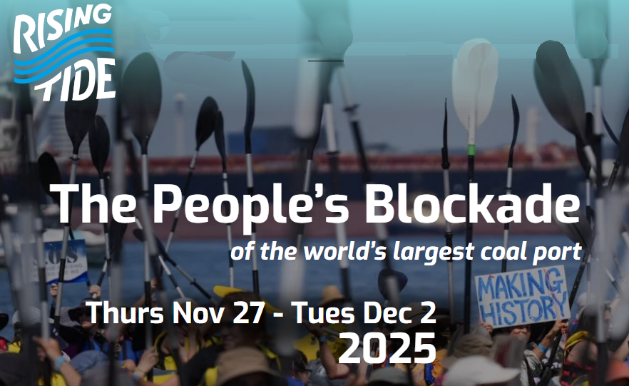 Being processed for hours in the police compound was the high point chanting back and forth with our supporters thronging outside the fence, Violet Maree CoCo on the megaphone outside "Tell me what democracy looks like - THIS is what democracy looks like". So great to have my 10-year-old River at his first blockade watching 15 year olds speaking from the stage along side old mate Bob Brown. I'm feeling so inspired and empowered. Next year we'll be 10,000. WE ARE THE RISING TIDE! My 9 year-old son River, participating in his first blockade, suggested that we should fine the cops for littering" for allowing our kayaks to just drift away down the river after hauling the protestors onto their Darth Vader craft. Interesting that the police response was so polite and gentle, obviously ordered from above to be on best behaviour, this was the only criticism that I can make of their conduct. As one of the 109 arrested (and having been arrested at many direct actions over the last 43 years) I was impressed. Given NSW Police Minister Catley saying last week ahead of the protest: I applaud people for getting involved, I think that it's important that people are having these discussions we all know where things are headed, I'm wondering if there may be elements of the government who want our movement to grow so that they have any chance to withstand the power of the Murdoch Press and the corporations? When Leonard Cohen sang: "The widowhood of every government" surely he is pointing to the death of the citizen without whom the government is powerless to withstand the brute force of corrupt media and vested interests. After the sweet young cop arresting me had said his piece I replied: "You and I are both tiny bit players in the theatre of social change. The only difference is that you're getting paid double time for working on Sunday while I'm doing it for love and for the sake of your grand children as well as mine". Click here for the RisingTide website